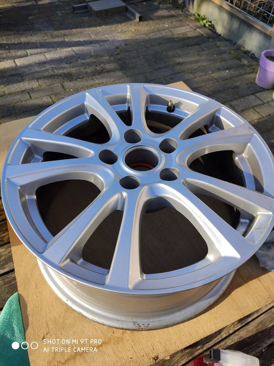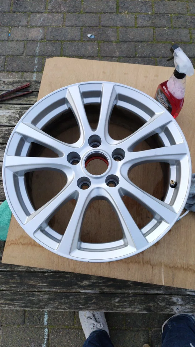 Ik heb mijn set velgen schoon gemaakt (zie pics) waardoor nu de beschadigingen geheel duidelijk zichtbaar worden. De beschadigingen bestaan uit: stoeprand schade op de rum (rand), kleine langs krassen op de velg en lak dat af bladderd. Mijn bedoeling is om de velgen de kleur gun metal te geven alleen ik heb jullie kennis nodig om te weten welke volgorde ik aan stappen (stappenplan met bijbehorende producten / handelingen) moet hanteren om het gewenste resultaat te bereiken. Wellicht is het monnikenwerk, maar ja ik wil het graag zelfstandig uitvoeren! (Kan nu toch niet het huis uit ) Ik weet dat ik om een heleboel kennis en kunde van jullie vraag, maar ik hoop dat jullie bereidwillig zijn om mij van een goed stappenplan te kunnen voorzien!!
