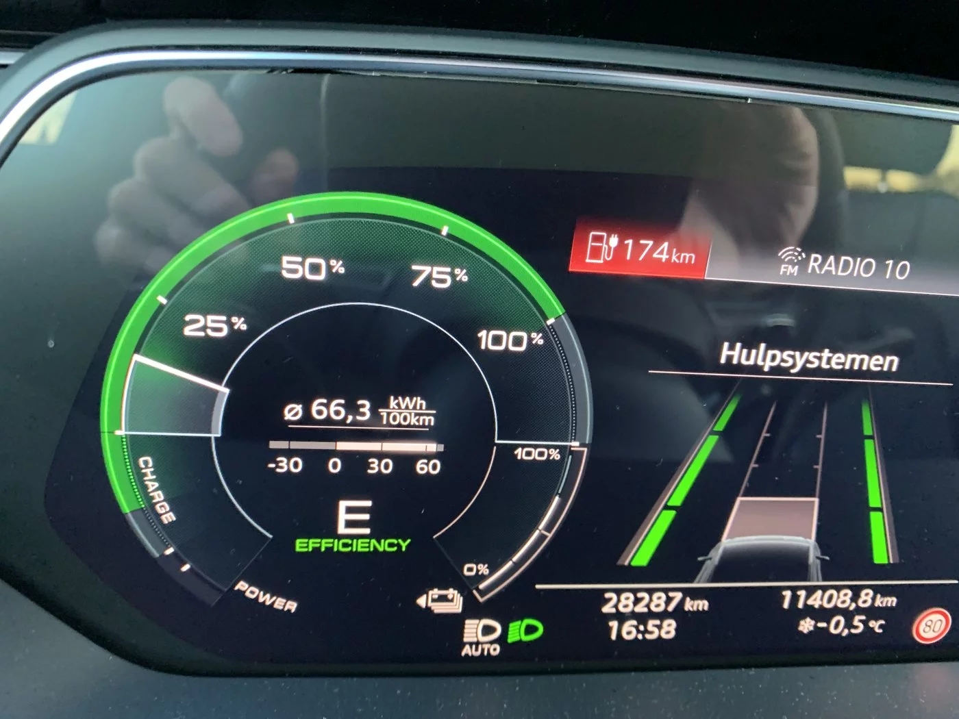 Deze is van gisteren, 174km op een 70% batterij. Tuurlijk haal ik in de zomer een stuk meer (ca. 325), maar hoe vaak rijd je continu 250km+ op een dag.